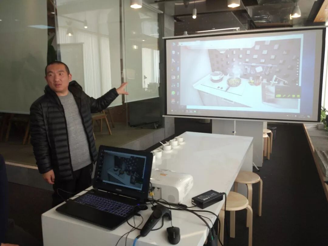 设计师李迪一边为他讲解方案的设计,一边引导着他在场景中移动。